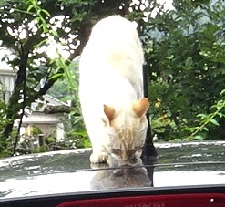 屋根に乗るノッコ 家に来て8年 その前は大人でのノラ生活 車と違って車検証はないが、10数年は経っているはず 車に乗って、ウメマークの足跡をつけたり、ヤギに追いかけられると、車の下に隠れて遊んでいる