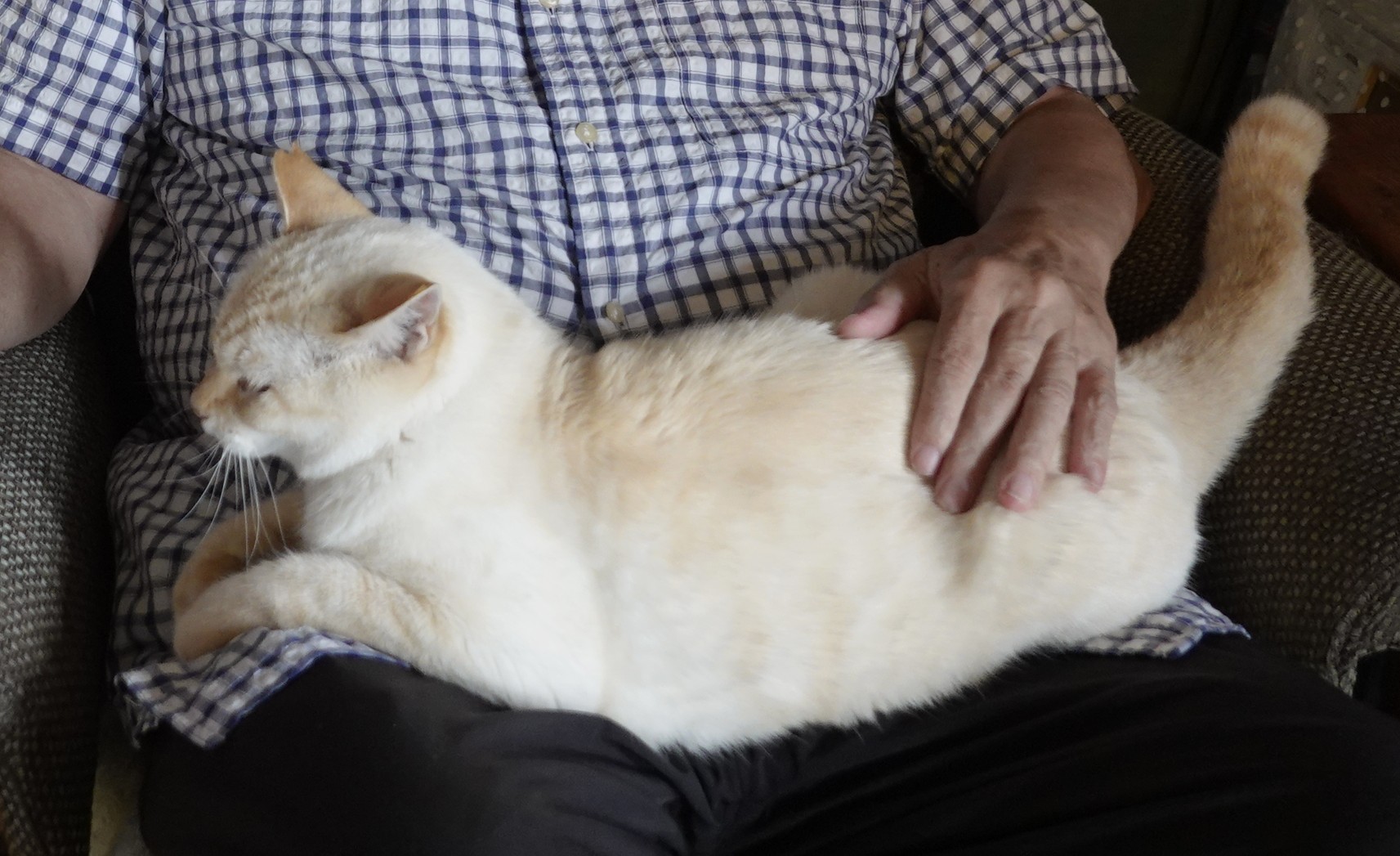 ソファーでテレビを見ていると足の間に座ってきて一緒に寝ている 体を撫ぜたり、頭をさすると嬉しそうに、うっとりしている