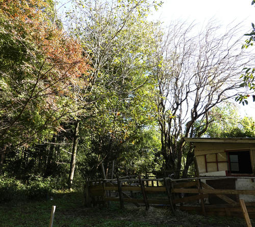 植えた木がほとんど シダレサクラ クルミ モミジ 種が落ちて成長したカキ カシの樹 自然のようで、植栽 モミジ色づいてきました
