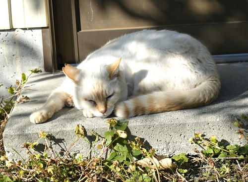 ジュンはブルーベリーの下の草を食べ ノッコは倉庫のコンクリート敷きで日向ぼっこ
