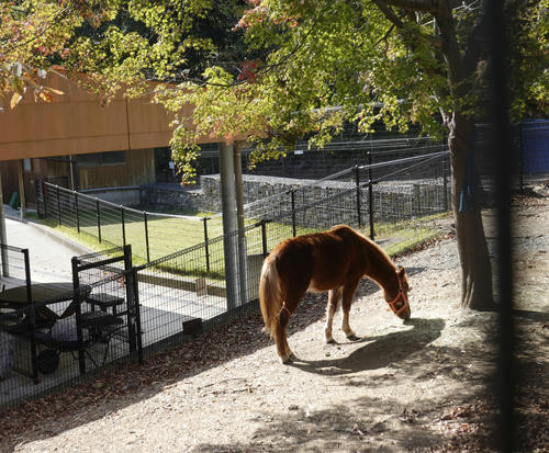 いつも訪問する、ポニー君は紅葉の陽を浴びて、毛並みがきれい