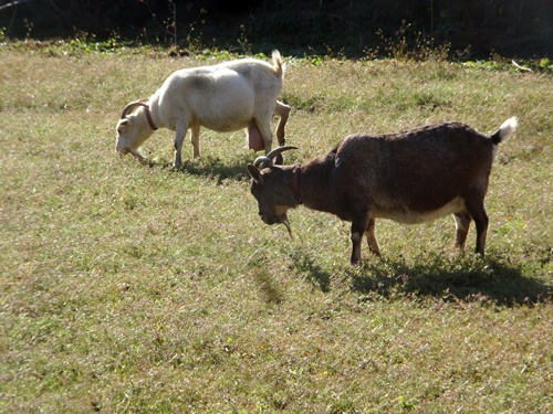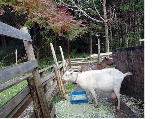 でも性格は違う。親分の白ヤギ メイは常に先頭を歩き、茶ヤギ ジュンはつきそう。エサ箱別々にして食べさせても、メイが横取り、じゅんは引下がる。それなら一緒に居なくてもと思うがヤギ不思議。