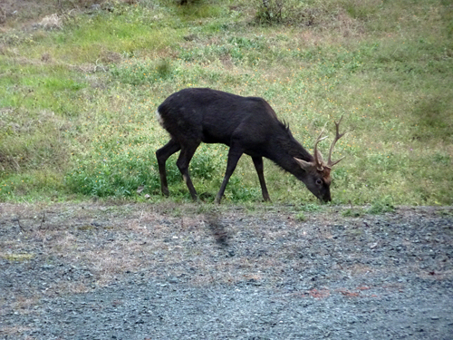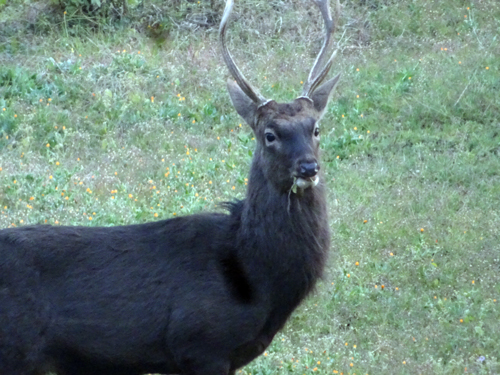 オスの立派な角をもつシカ。以前も仔シカと一緒に、ファミリーで来たこともあり。