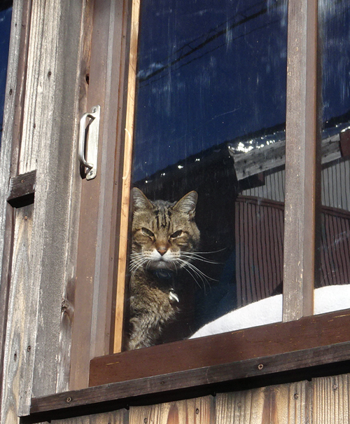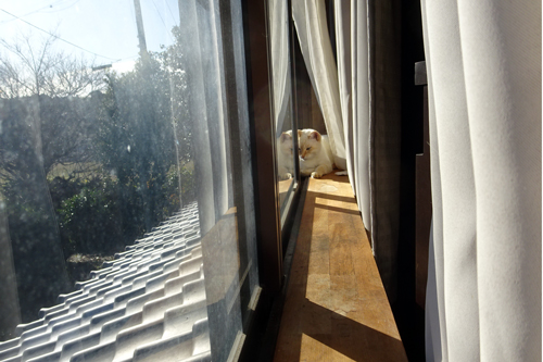 窓ガラスで風なし、暖か。庭は見えるし、誰からも邪魔されない。狭い場所も大好き。半分寝ている、うとうと状態です。