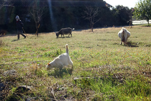 隣の畑は、生垣で防風効果あり。風が吹かねば暖かい。ヤギのランチタイム。ノッコ、主食は草ではないが、ランチに同席。一緒にいたいのです。ここは、トラクターはかけず草が豊富です。