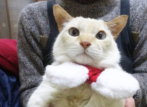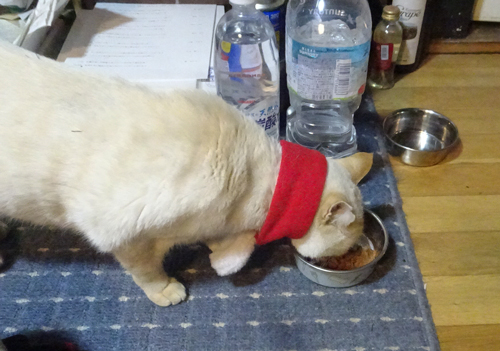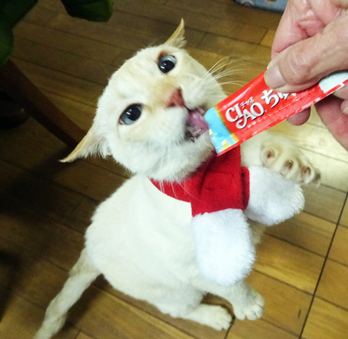 ネコさん達、紅白のサンタマフラーを付けて、ごちそうは、チュール。