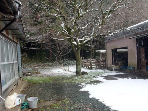朝 ノッコ外へ出たら雪を見て、軒先でUターンして室内へ戻る。