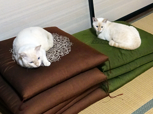 写真のネコ君 高い座布団はトモ ノッコが元ノラ君をいい家だよとお誘いして来た。。ノッコが緑の座布団で仲良く。
