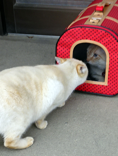 1ヶ月後 友達を連れて来た。ネコ語で、ここいいよ おいでヨとお誘い。トモとなずけ。二匹とも痩せていた。