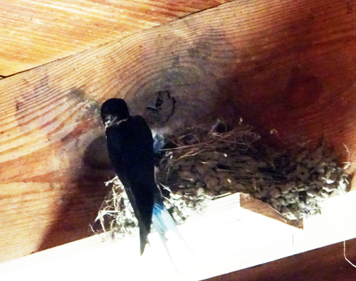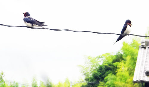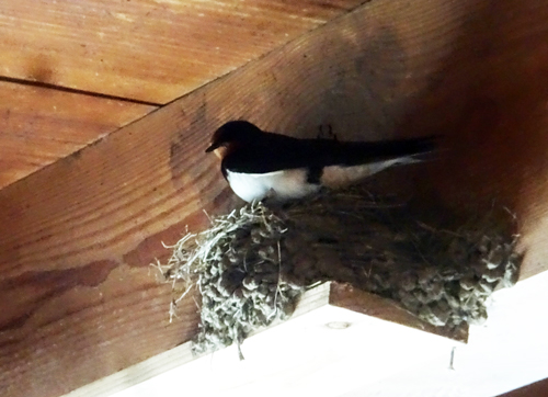 ツバメ君 早朝に室内で鳴き、外に出してとアピールする。玄関戸を開けると、二羽飛び出し、すぐに、戻り巣作りに一日中励む。時おり別のツバメが室内に飛来すると、ここ、私たちの家と二羽で排除しています。
