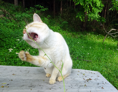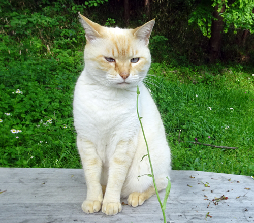 奥さんの短歌仲間で、先生、大御所ばかり。皆 短歌集を発行している歌人です。豊橋からの来訪者 庭のサクラと、ヤギもおもてなし、ネコも、たくさん来たなと近くで様子を窺っている。自然に生えている、日本スミレや希少種植物に大喜び。日頃見慣れている植物だがこちらより詳しい。さすがです。