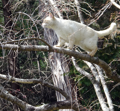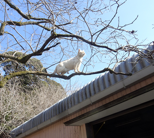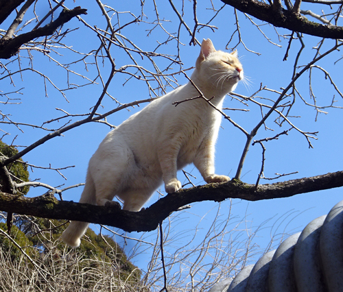 写真は、カキの樹の細い枝まで行きご機嫌。枝が折れて落ちるかと、興味深々で楽しみに見ていますが、落下したこと無し。