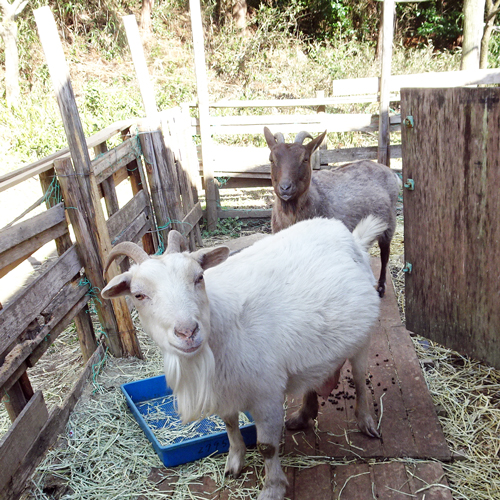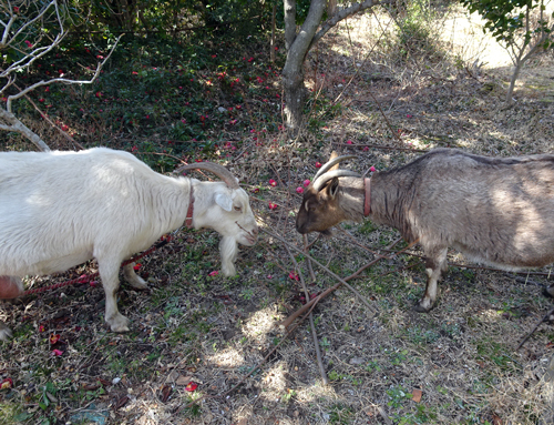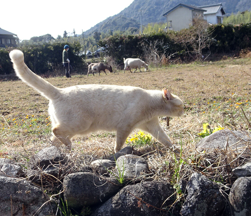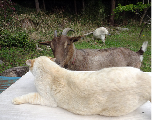 ヤギ、ジュン 興味をもち、ちょっかいを出すが、ネコ逃げる。