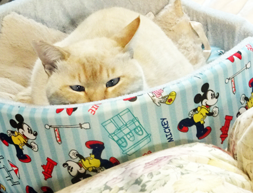 ノッコの朝の顔 ネコベッドから目だけ出してこちらを見ている。動かずにいるのは、動きたくない。数日前の寒い日の朝です。