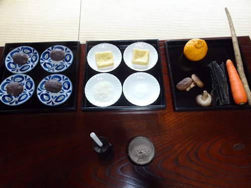 お供えは、海の物、山の物、油揚げ、米、塩などと共に、奥さんが前日から小豆を煮てつくるおはぎ。