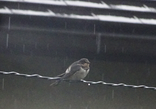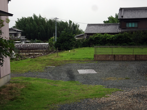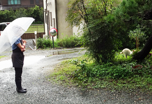 雨の日 畑の端でたたずんでいる。緑に、シロネコは目立つ。