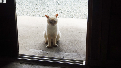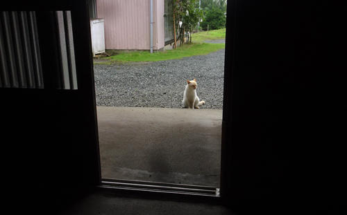 玄関に、こちらが居ると礼儀正しいというか、じらすのか、正座で待っていて、少し経つて入って来ます。