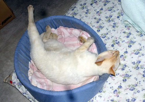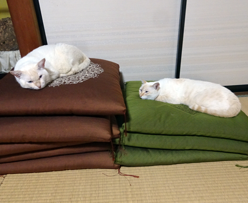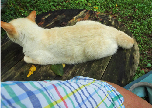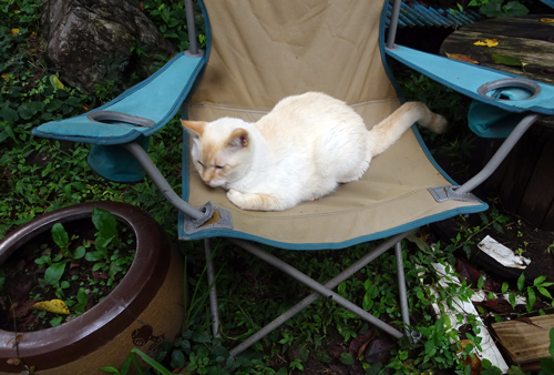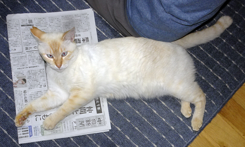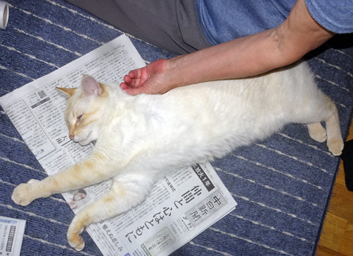 妻には、座っていると、こてんと寝て、身体を撫ぜろとせがむ。止めると、もっとと、眼と鳴き声でアピール。