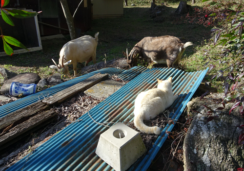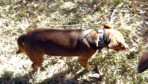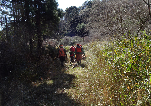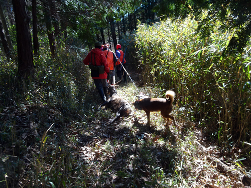 話しを聞きつつ帰り同行しました。猟友会メンバーが、捕獲シカを引きずり、猟犬3頭が見守っています。イヌの首にはアンテナが2本ついていて聞いたら、これGPS。