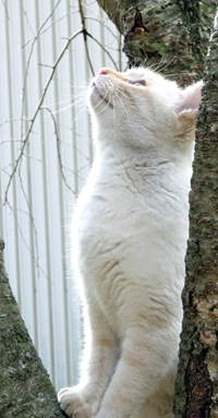 1年程前の冬 痩せたネコが家周りでミャーとなき、台所前でたたずみ、エサをあげると、翌日も来る。可愛い瞳でこちらを見つめる。こちらがメロメロ。その後 避妊手術をし家ネコ状態。三食食べ、ネコベッドで寝て、昼間は室内で日向ぼっこ。ヤギや家族といつも一緒にいたいと、呼べばどこからかとんでくる。時には一緒に歩くようになりました。