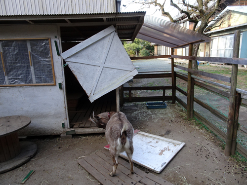 そして、雨が苦手なのがヤギ達。ほんとに雨嫌い。部屋のなかで、「雨だ~」とたたずんでいます。最近は、ネコをかまう事が多いので、今日は、やぎ舎訪問。2人ともウエルカム。かまってもらうのは嬉しい。狭い部屋内で和気あいあい?板の間に座り、同じ目線でお相手しています。これ、ヤギ喜びます?
