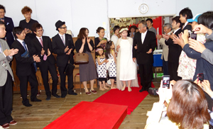 ・敦子さんは、お父さんとバージンロードから入場、お父さん緊張気味 花嫁さん