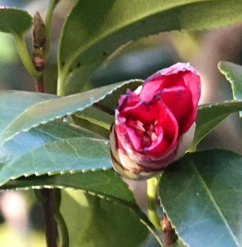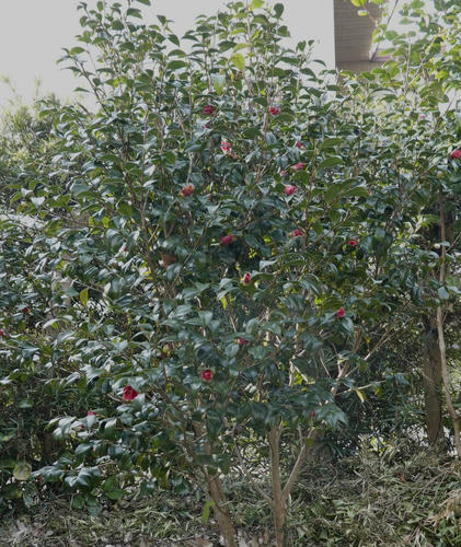 庭には5本ほどの藪ツバキの木があるが、大きな樹から種が落ち育っている サクラやウメは自生しないが、ツバキは、植生が違うようだ