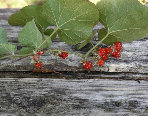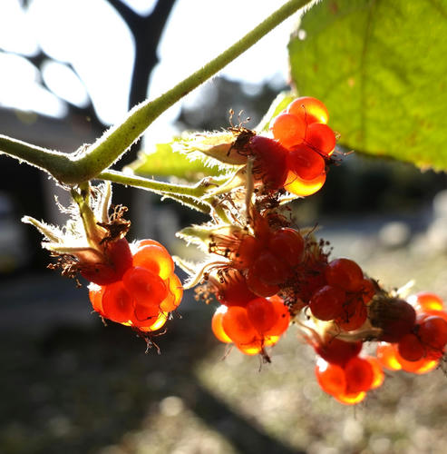 蔓性のバライチゴ 小さな赤い実を付けている バライチゴは春に実を付けると思うが 秋に実をつけている