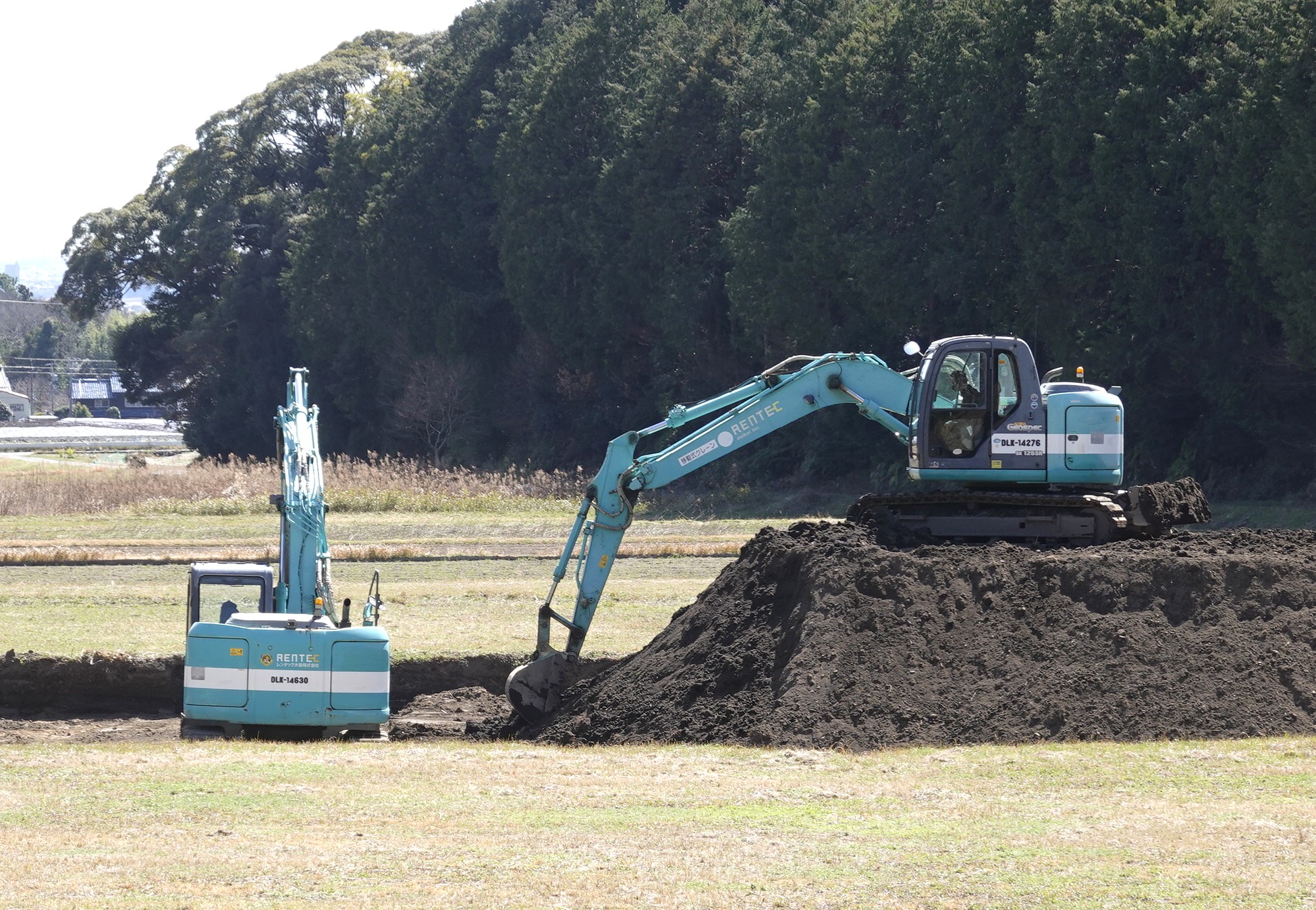 北側では油圧シャベル(ユンボ)で土作業をしている ソーラー用地だと思う びっくりするのは、土の大きな山を築いている プロの技術は凄い