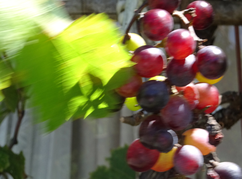 庭のブドウの樹 今年は実りが悪いです。無農薬 無肥料でもたくさんの房を着けていたのですが、来年に期待です。品種は、マスカットベリーA 黒い果皮で糖度の高いブドウで、巨峰のミニみたいなブドウです。毎日摘まんで、皮のままほおばり楽しんでいます。
