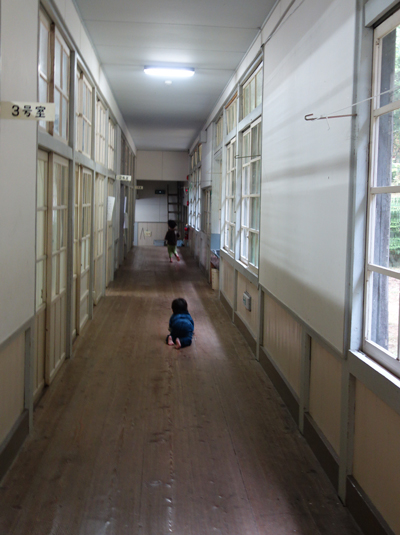 旧門谷小学校は木造校舎 来場者がいない朝夕、スタッフの子ども達が楽しそうに走り回っていました。素足に木の肌あいはいいのでは。私 教師ではありませんが、子どものとき、学校の廊下を走らないことと言われていました。幼児がお兄ちゃんのそばで、はい歩き。確かに、廊下を走ってはいませんでした。この子たちが、成長してもイベントが続きますように。