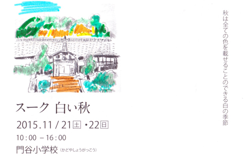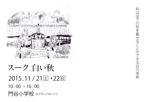 鳳来もみじ祭の期間 11月21日(土)22日(日)に旧門谷小学校で、スーク 白い秋と題して、絵画展 昭和の生活展などが開催されます。ネーミングが良い。「スーク 白い秋」… 秋は全ての色を載せることのできる白の季節とのキャツチコピー