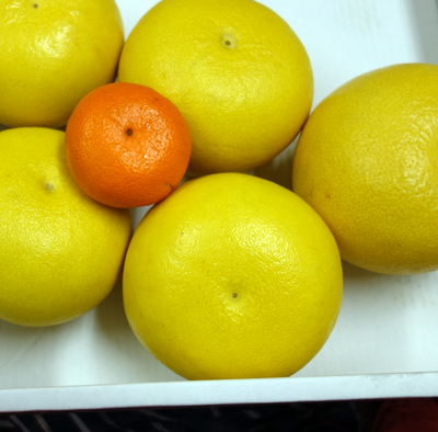 高知県の親戚から文旦を頂きました。大果実で、比較に置いた温州みかんと比べてもやはり大きい。キンカンを置いたわけではありません。皮が厚く、全部が果肉ではないが、さっぱりした甘みで大きい割についつい食べてしまいます。ブランド名は、土佐文旦 高知文旦とはいいません。高知と土佐、福岡と博多 行政名と、明治以前から馴染んだ地名がある場合には、親しまれるのは文化を育んだ土地のイメージの浸透した、博多や、土佐と感じます。