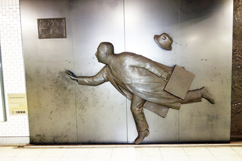夏休みに入った日曜日の名古屋は賑やかです。とある用事で、吹上ホールに行く折 地下鉄吹上駅の通路壁面に、男性が駆けているオブジェが。銘板には「PLEASE DO NOT RUN」