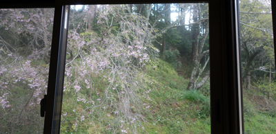 築60年の古民家で、しつらえは、農家住宅のあばら家です。おもてなしするような住環境ではありませんが、周囲は前も後ろも横も、緑に囲まれています。そして、一番のおもてなしは、桜 開花時期の異なる桜の木々が咲いている頃。