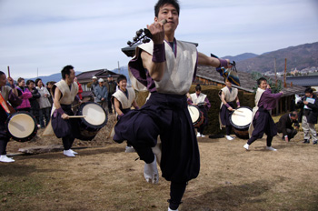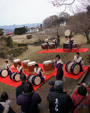 奉納は、雪をいだいた山々を背にして、たたき、奏で、舞いました。