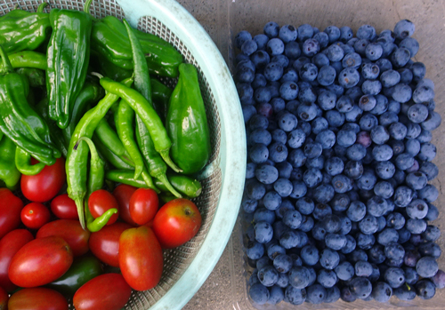 家の畑で摘んだ実と。砂糖、ハチミツでブルーベリージャムを作る。砂糖控えめ、甘みが薄くてよい。