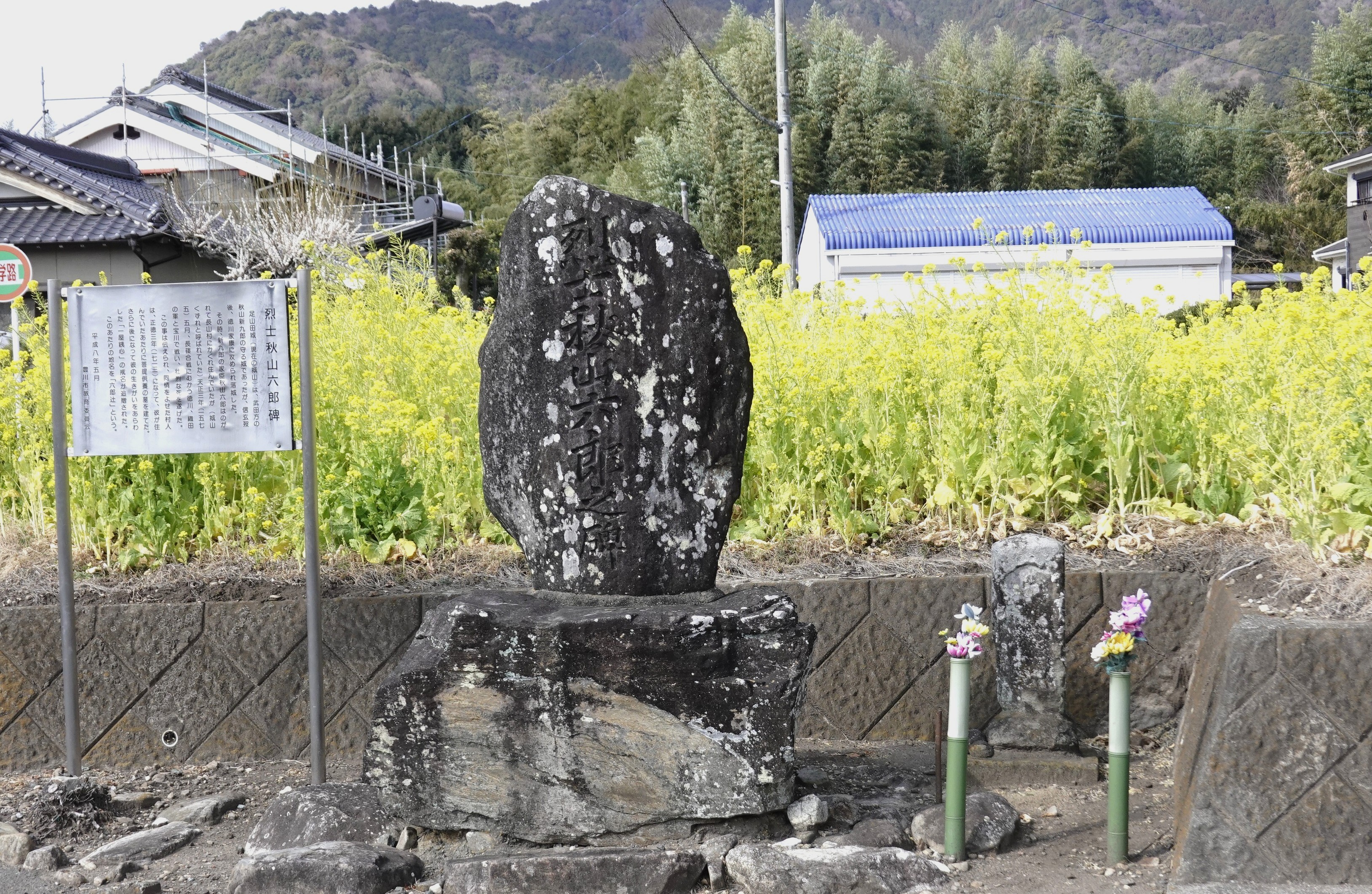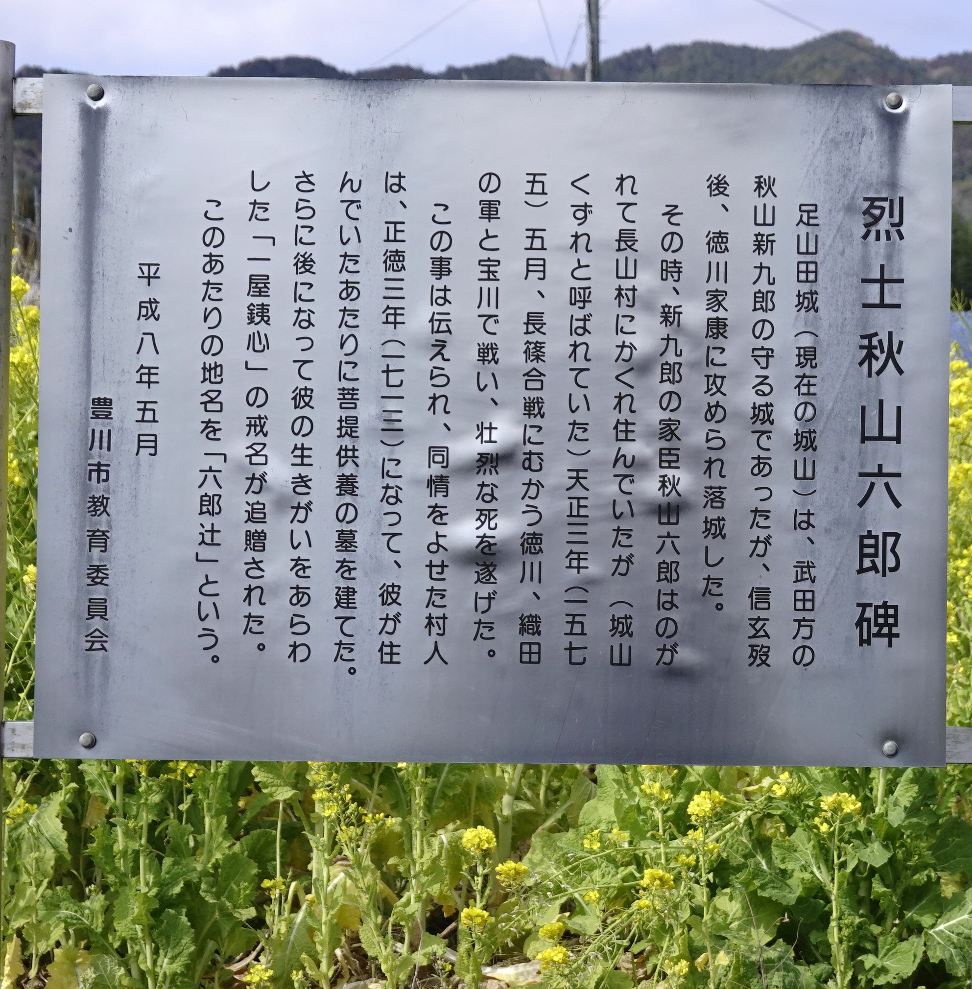 道路の一角に、石碑と市教育委員会作成の碑由来の看板が設置してある 石碑には「烈士秋山六郎之碑」と刻んであり戦国時代武田信玄方の家臣の秋山六郎がこの場所で隠れ住んでいその後戦で戦死 1713年に地元で供養の墓を建て、その後1919年に今の碑を建立したと記してある
