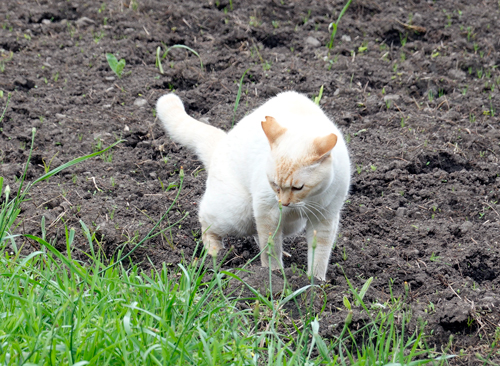 食事と寝るのは室内で一緒だが、排せつはノラ時代からの習慣で外で 慎重に周囲を窺いながら用をたす。室内にトイレは在るのだが、使用しない
