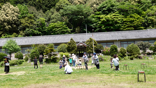 校庭は人で賑わい、シロツメ草も白い花が咲いています