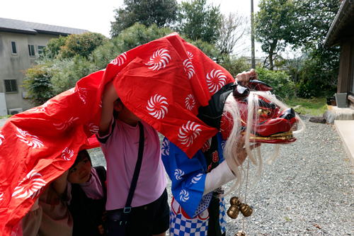 案内係の祭礼役員とお母さん、嬉し気に同行。獅子は、男子と女子用の2つの獅子 一緒に同行。迎える家々 子ども達が来ると、それぞれのお獅子の口に500円硬貨を入れて嬉しそう。子どもの参加する祭礼は良い。