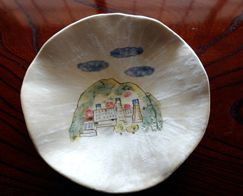 嬉しいものを頂戴した。高校の同級生の酒井さんが作陶した陶器。私の、本宮山イラスト画 絵付けしてある。オンリーワン作品です。