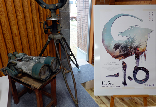 ゴジラ 1.0(マイナスワン)がアカデミー賞の視覚効果賞を受賞。映画に登場した双眼鏡と三脚が、豊川市海軍工廠平和公園ロビーに展示してあります。