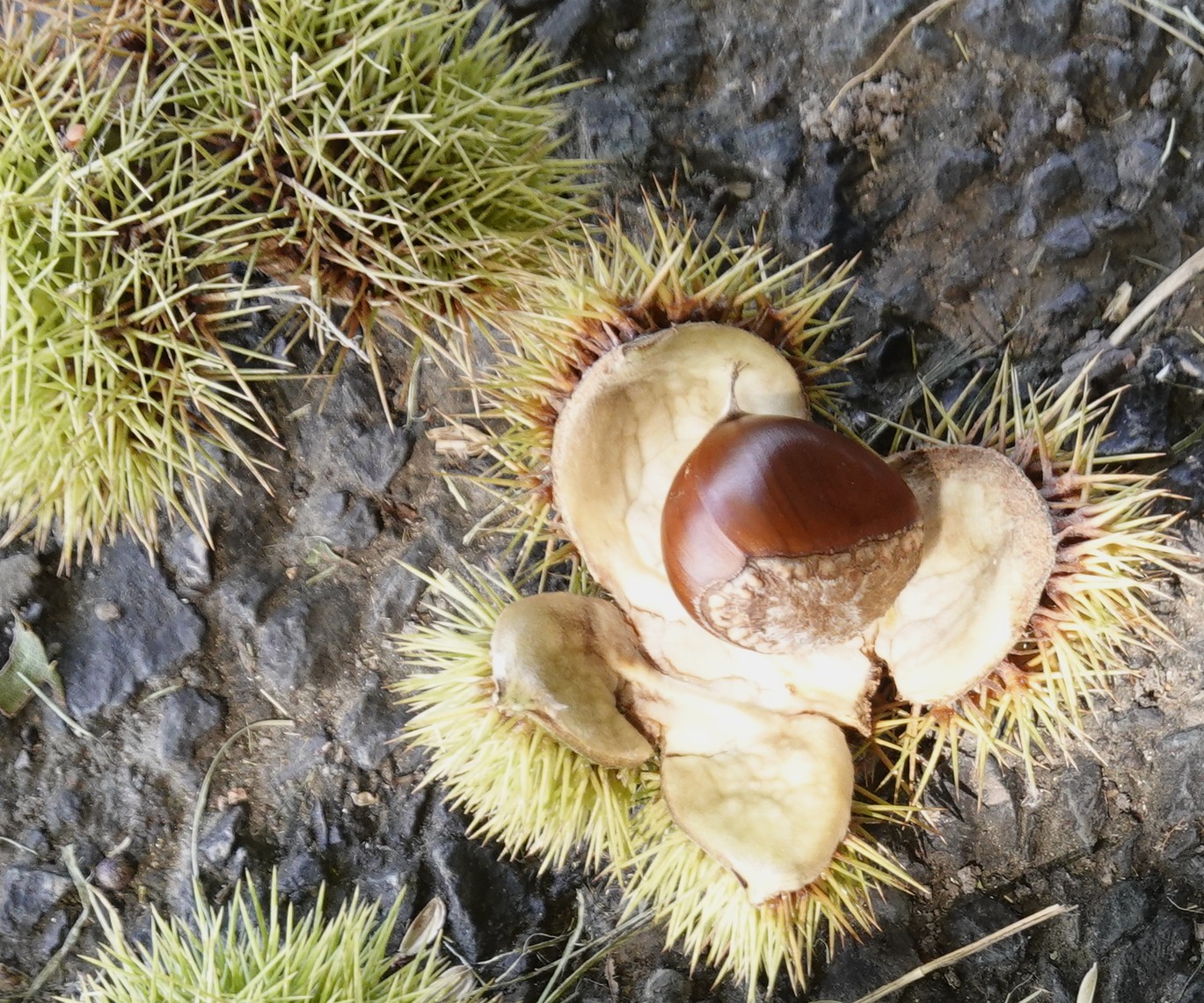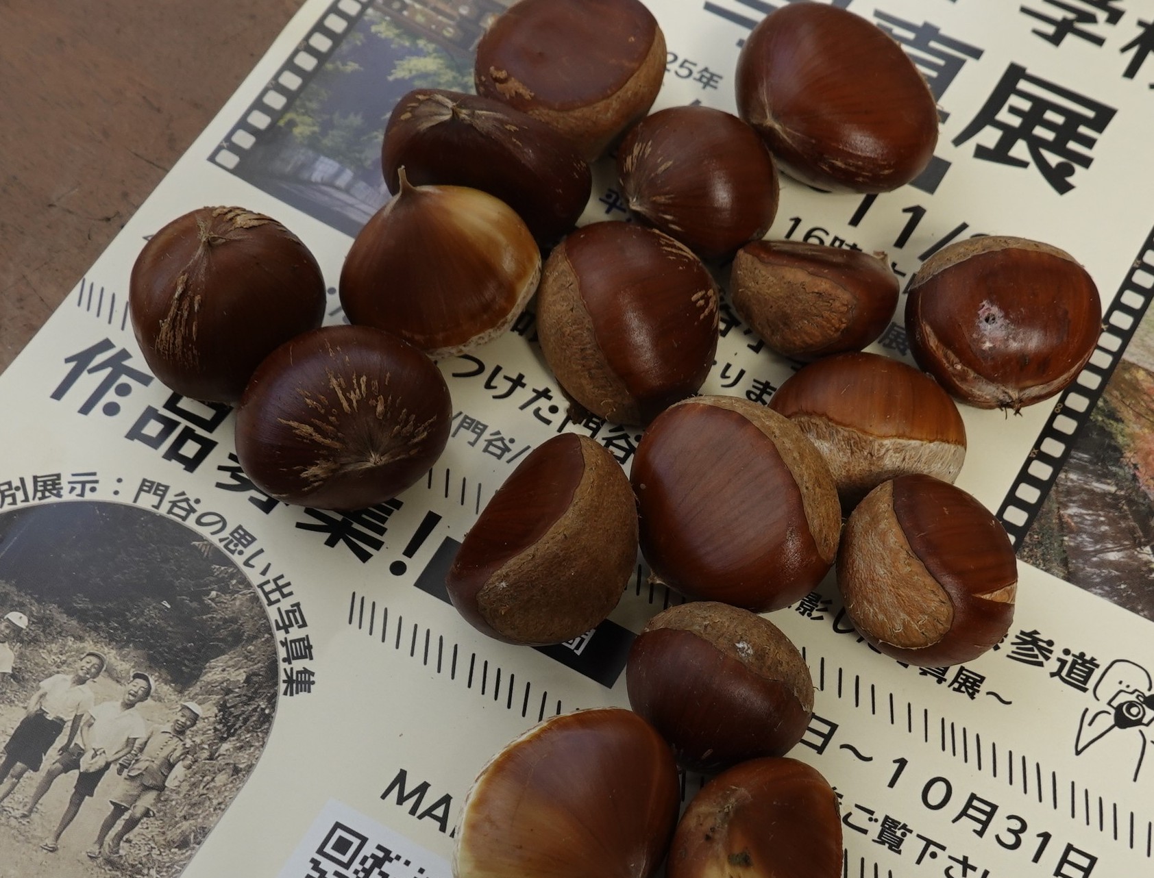 鳳来 門谷小 知人と珈琲 ちょっと待ってといい、近隣の自宅のクリを拾ってきてくれ採りたてだと沢山頂戴 クリもうれしいが 気持が嬉しい