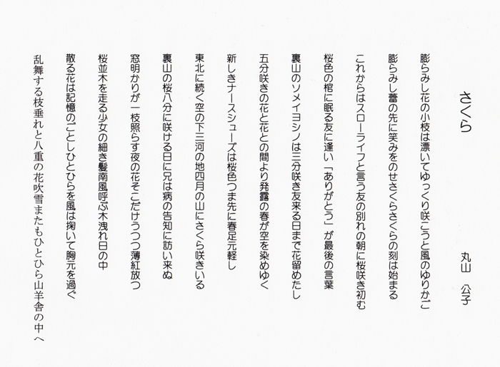 短歌は、身近な事を詠い、蕾から散るさくらの順番に配しています。そして、近親者との悲しい別れの桜もあります。