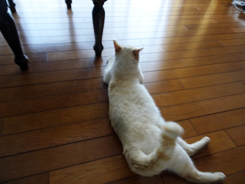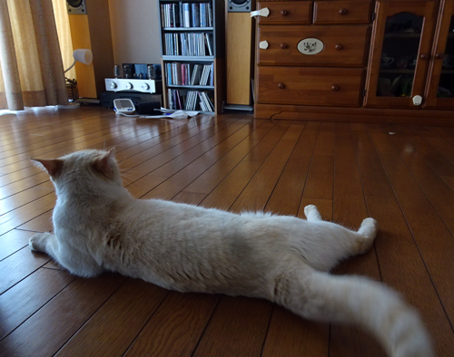 松の剪定中、近くで座っていたり、休憩に室内でテレビを見ていれば、ついて来て一緒に寝転がっている。最近は、ネコとの関係は、付き合い時間は長いし、関係も濃密。