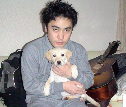 はなが家に来た時の、2男とのツーショット。会社員であり、ある時はミュージシャンのY平。時おり帰省する度に、はな、会えばシッポフリフリで喜び表現しています。