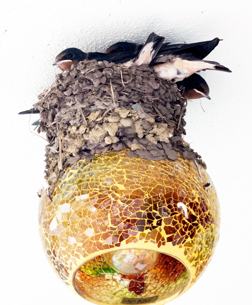 前日紹介したカレー店の玄関の照明の上にツバメが巣を作り、大部成長した 巣から身体をはみ出し、羽ばたいている 賑やかであるが 未だ飛び立てない そのうちに巣立っていくのでは