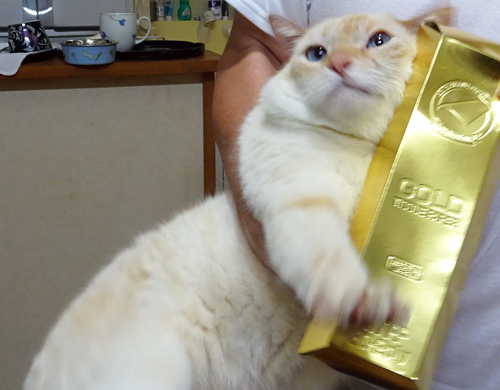トモが金塊をもって、写真撮影。本人嫌がっていたが、おやつで撮影協力。ノッコと違い近くにあるもの全部食べる食いしん坊です。持病があるので体重コントールが必要なんですが、食べたくてしょうがないのに、食べれないのは切ない。