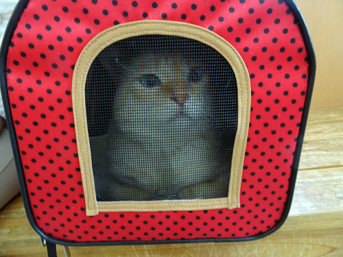 トモは、ネコかごの中 血尿が出たので、かかりつけ医へ、赤いネコカゴから見ています。採尿検査と膀胱触診で、膀胱炎の診断です。抗生物質を投薬処方。持病があり、膀胱内にストルバイト結晶が増えると、尿道が詰まる可能性があるので、定期受診をしています。